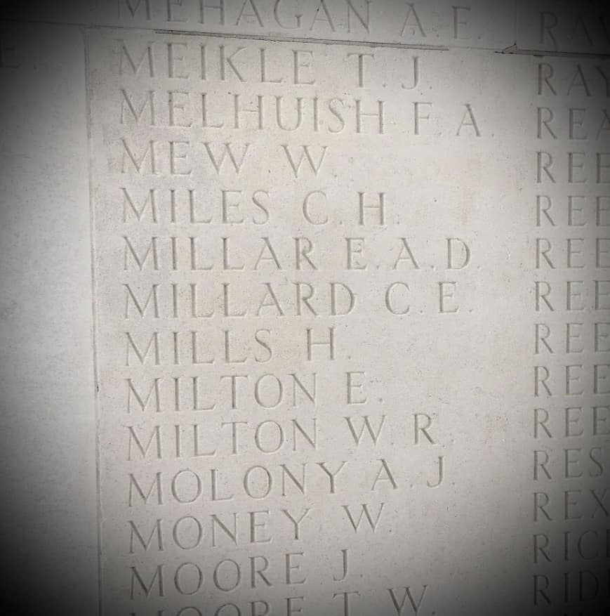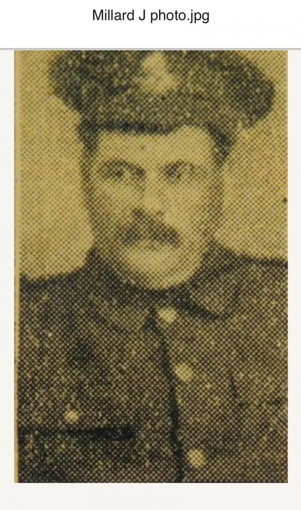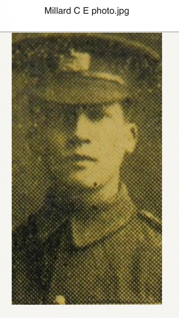 The 8th Glosters, remarkably in the conditions, reached Grandcourt but were unable to stay there as units on their flank had not advanced sufficiently, leaving them exposed. The mopping-up parties had a hard time suppressing fierce German machine gun fire. Somewhere in the mud and slime of the shell-torn ground, Pte Millard met his death. Initially, he was reported wounded and missing and it was not until March 1917 that his non-appearance 11and lack of reported capture led to the conclusion that he was one of the last to die on the Somme in 1916. No grave was ever found and, if you visit Thiepval, you will find his name amongst the vast columns which record those of over 73,000 who fell in the Battle and similarly disappeared.