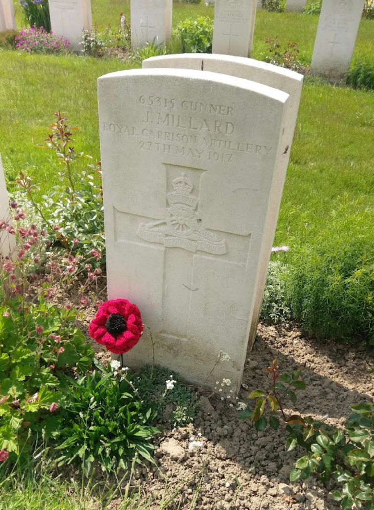 Having received confirmation of Charles’s death, Mr and Mrs Thomas Millard were soon to receive the tragic news that another of their eleven children had died in the War. Joseph, age 32, had left his job at Tytherington Quarry to join the 31 Heavy Artillery Battery of the Royal Garrison Artillery, which was responsible for the large guns on the Western Front. On 26 May 1917, taking time off from duties as battalion cook, he went for a swim in a river near Armentieres. It is believed that, with the onset of cramps, he got into difficulties and drowned. He was buried locally.