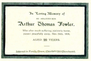 Arthur Thomas Fowler was born in Charfield in April 1896, the youngest child of Thomas and Emily Fowler (née Workman). He grew up with four siblings—George, Albert, Mabel and Leah—and a stepsister, Ellen Workman.